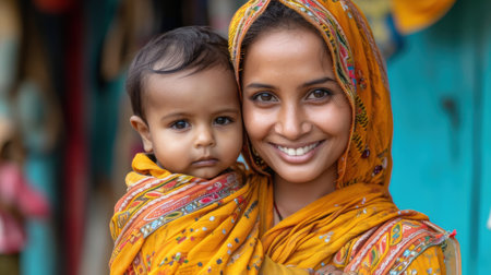 A beautiful South Asian woman in a vibrant traditional outfit smiles warmly while holding her young child, portraying deep family bonds and cultural pride.
