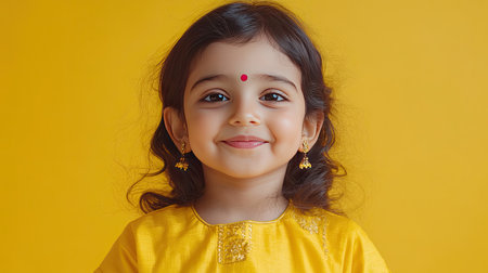 A joyful young girl wearing vibrant yellow attire and accessories smiles warmly at the camera, radiating innocence and cheerful energy against a bright background.