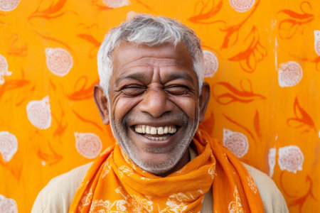 Portrait of a happy Indian senior man wearing orange scarf against orange background