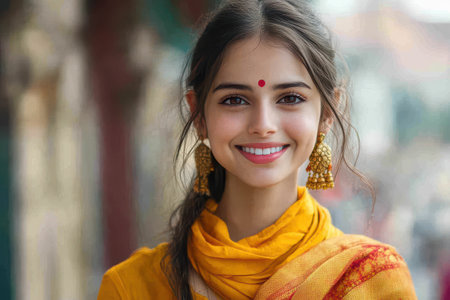 Portrait of a beautiful young Indian girl with striking blue eyes, wearing a yellow headscarf and traditional jewelry, showcasing her cultural heritage