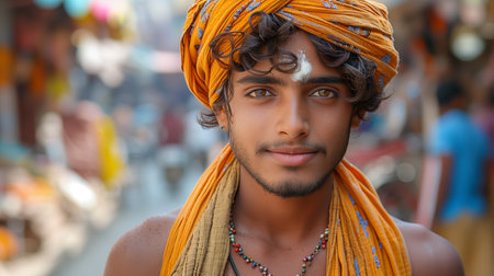 Portrait of Young Man Wearing a Traditional Orange Turban in a Busy Indian Street