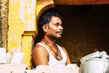 Varanasi India November 10, 2018 View of a unknown people selling chai in a small tea shop in the Ghats of Varanasi in the afternoon