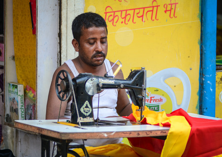 Gaya, India - Jul 22, 2015. Portrait of Indian man tailor at work place with sewing machine at the market in Bodhgaya, India.