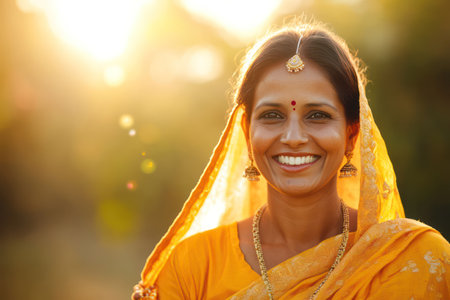 Elegant woman in golden-yellow sari smiling warmly in natural light, symbolizing cultural pride, confidence, and graceful beauty.