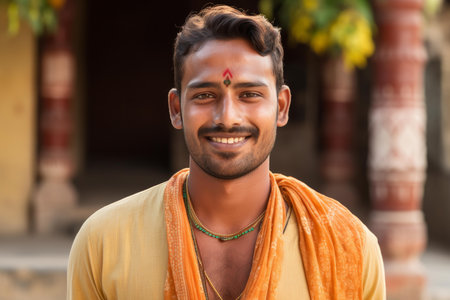 Young happy indian priest smiling and wearing traditional orange clothes