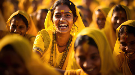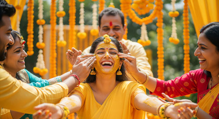 A joyous Indian bride laughs as her family members apply turmeric paste to her face and body during a haldi ceremony, surrounded by yellow floral decorations.