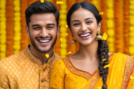 Young newlyweds wearing traditional yellow clothing smiling during a Hindu wedding ceremony with falling flower petals