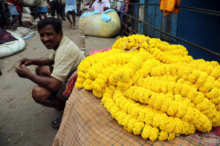 People buying and selling flowers and garlands at the flower market next to a railway track on February 15, 2014 in Kolkata Calcutta , West Bengal, India