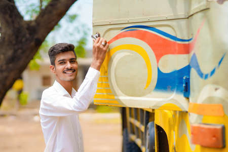 Happy smiling young indian labour busy on mobile phone at workplace - concept of using social media application, technology and leisure activity.