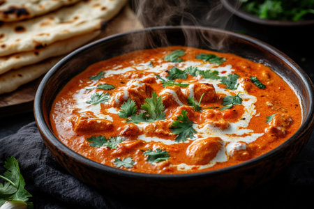 A steaming bowl of hot butter chicken paired with fresh naan bread, garnished with cilantro and cream.