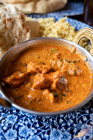 Delicious butter chicken curry served with rice and naan bread
