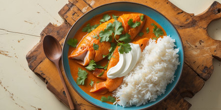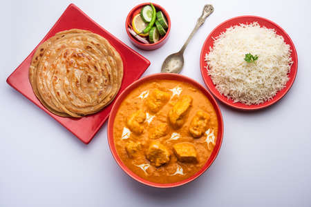 Tasty butter chicken curry dish from Indian cuisine served with rice and paratha