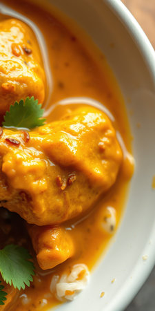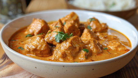 Delicious homemade chicken curry served in a bowl with fresh herbs at a cozy kitchen setting