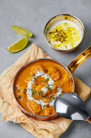 Murgh Makhani or Butter Chicken in copper bowl on gray concrete table top. Indian Cuisine dish with chicken meat and creamy masala. Asian food and meal.