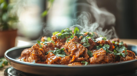 A steaming plate of spicy chicken garnished with fresh herbs, creating an appetizing look. Perfect for food lovers seeking flavorful and comforting meals.
