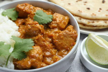 Delicious chicken tikka masala with rice, cilantro, lime and lavash on gray textured table, closeup