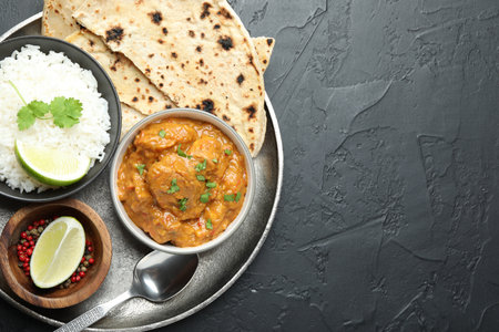 Chicken tikka masala, cilantro, rice, lime and peppercorns on dark textured table, top view. Space for text