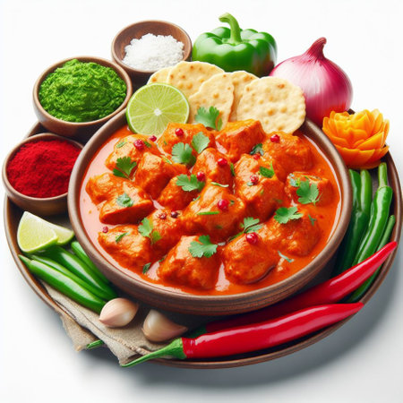 a table setting with chicken tikka masala, rice, and naan, created with generative ai