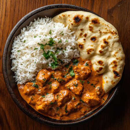 Delicious butter chicken with rice and naan bread