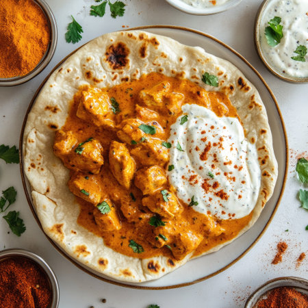 Top view of a serving of chicken korma in a traditional bowl, surrounded by spices and herbs, with naan bread artfully