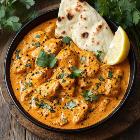 Creamy butter chicken in a traditional Indian bowl with soft naan, cilantro garnish, and lemon wedges on a wooden table. ae