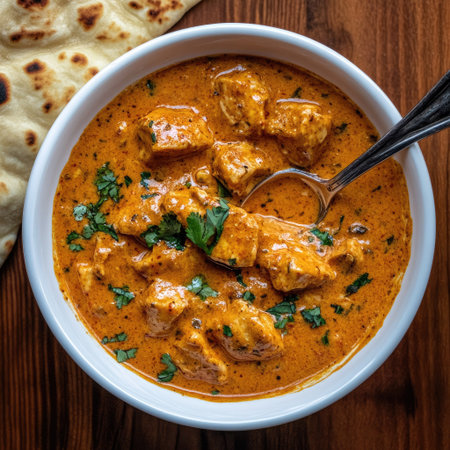 Discover the enticing appeal of a rich and creamy chicken curry served with warm naan bread. This dish is perfect for food enthusiasts looking for a comforting meal.
