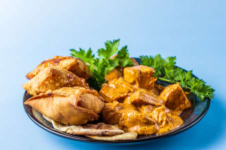 Indian snacks samosa garlic naan bread butter chicken on wooden table