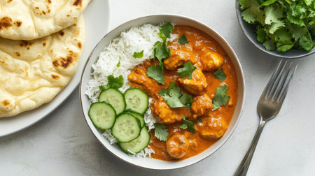 A top-down view of a bowl of Chicken Tikka Masala with a side of naan and fresh cucumber salad, presented on a white table for a clean, appetizing shot.