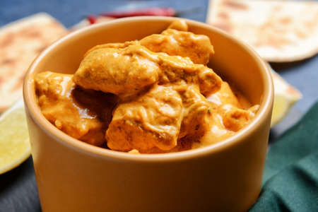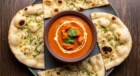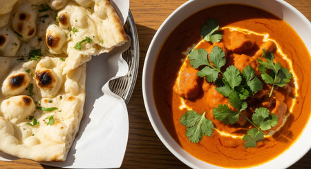 Indian tikka masala chicken and naan flat bread on the table. horizontal top view
