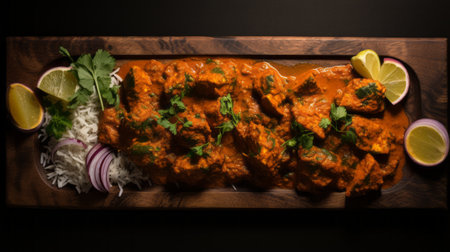 indian dark asian chicken hot wooden background masala rice sauce traditional. Generative AI.
