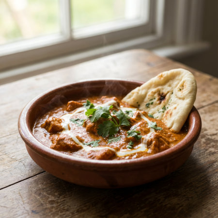 Hot, aromatic chicken tikka masala in an earthenware bowl, with fresh cilantro, cream, and naan bread. A cozy, comforting meal on a rustic table with soft window light.