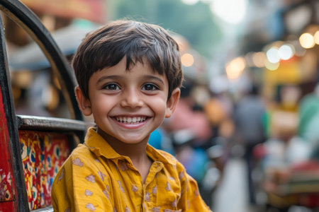 A young boy wearing a yellow shirt beams with joy, enjoying a ride in a rickshaw. The vibrant market street is filled with activity and colorful surroundings.