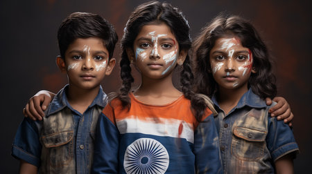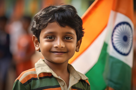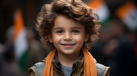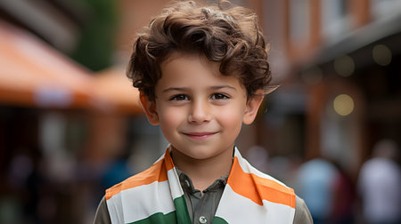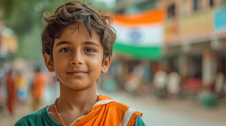 Portrait of a young boy radiating pride, dressed in colors reflecting the Indian flag, symbolizing patriotism in a festive street setting.