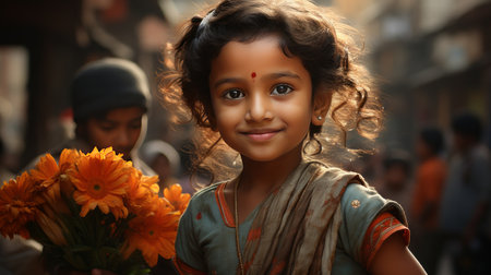A cute young girl with dark hair and expressive eyes proudly holds the Indian flag, representing national pride and joy.