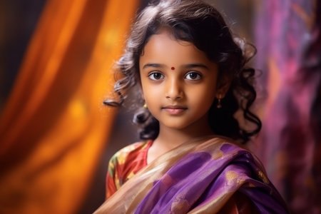indian little girl in saree and boho style clothing looking at camera