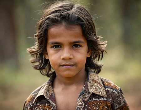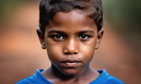 This captivating portrait showcases a young Aboriginal Australian boy, reflecting his rich cultural roots against a warm, natural backdrop filled with soft light and earthy tones.