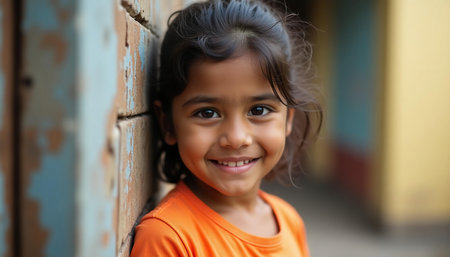 In a vibrant neighborhood, a cheerful young girl beams with joy while leaning against a rustic wall, showcasing her playful spirit and charm as the sun casts a warm glow around her.