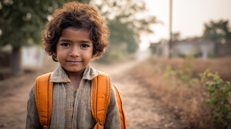 Young hispanic child with backpack on rural pathway in warm light.
