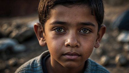 A young boy stares intently at the camera, his serious expression revealing a depth beyond his years
