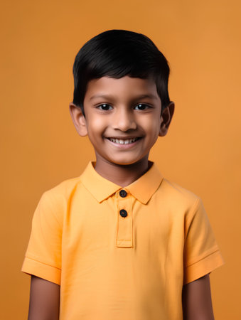 cute indian little boy in yellow t-shirt smiling at camera