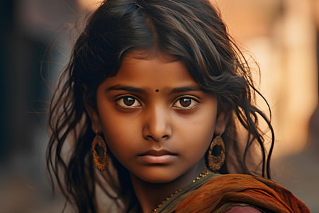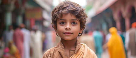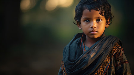 Portrait of an Indian child on the streets of India, a serious boy. AI generated.