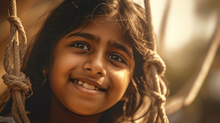 Close up smiling face, young indian girl playing on a swing, happiness, childhood, freedom, vitality, outdoor fun, carefree, sunlight. Generative AI AIG20.