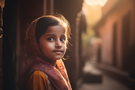 Portrait of a little Indian girl standing in the street at sunset
