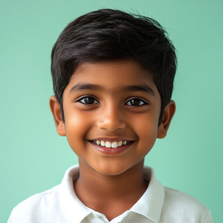 A smiling Hindu boy, 8-10 years old, in a joyful portrait against a pastel plain background, perfect for commercial photography and advertising campaigns