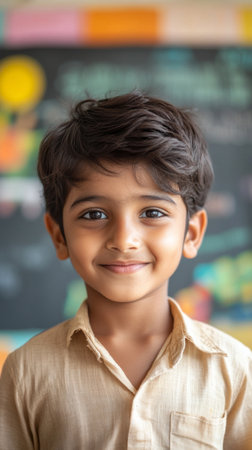 A cheerful Hindu boy, about 10 years old, showcases his bright smile in a lively classroom filled with colorful art and learning materials around him.