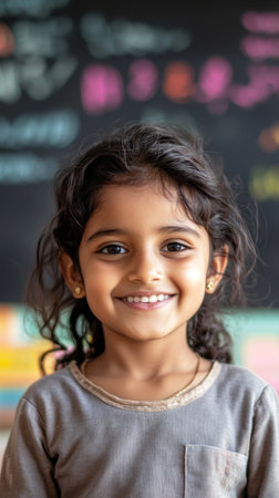 A cheerful Hindu girl around10 years old flashes a bright smile while dressed in a yellow outfit in an engaging classroom ,environment filled with colorful decorations.