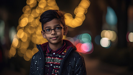Cute indian little boy with eyeglasses in the city at night