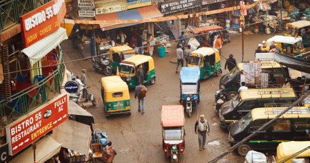 New Delhi, Delhi, India - February 04, 2024: Traffic On The Main Bazar road Street Paharganj. Cars, Motorcycles, Auto Rickshaw Or Tuk-tuk Moving On Street In morning