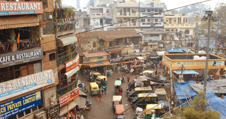 Delhi, India - January 27, 2017: ordinary crowdy city life at Chandni Chowk, Old Delhi, famous travel destination in India. Fisheye view.