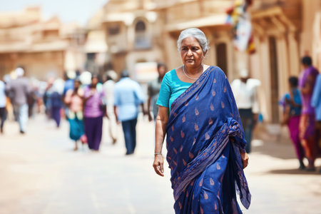 portrait of a native old Indian woman in national clothes in the city, personifying the national image of an Indian woman